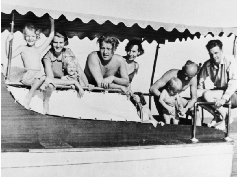 Heinz Koelle, at far right, with Wernher von Braun and Maria, at left with daughters Iris and Margrit, relax with Irmgard and Ernst Stuhlinger (holding his son Tillman), at center, on a 1955 outing on the Tennessee River near Huntsville.